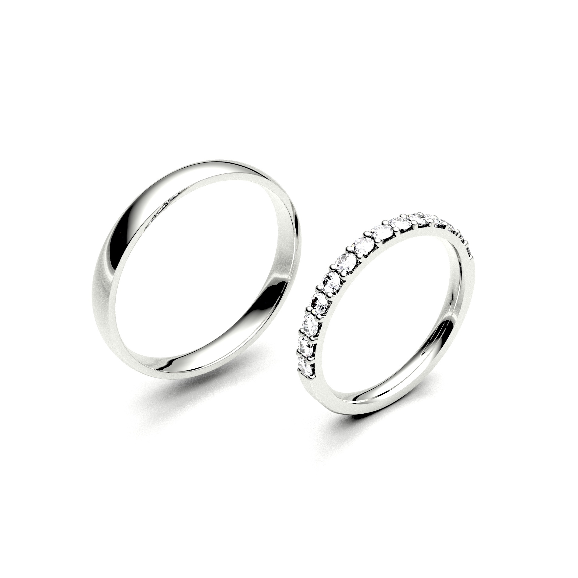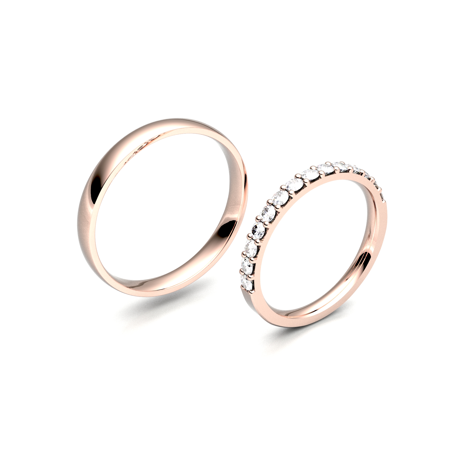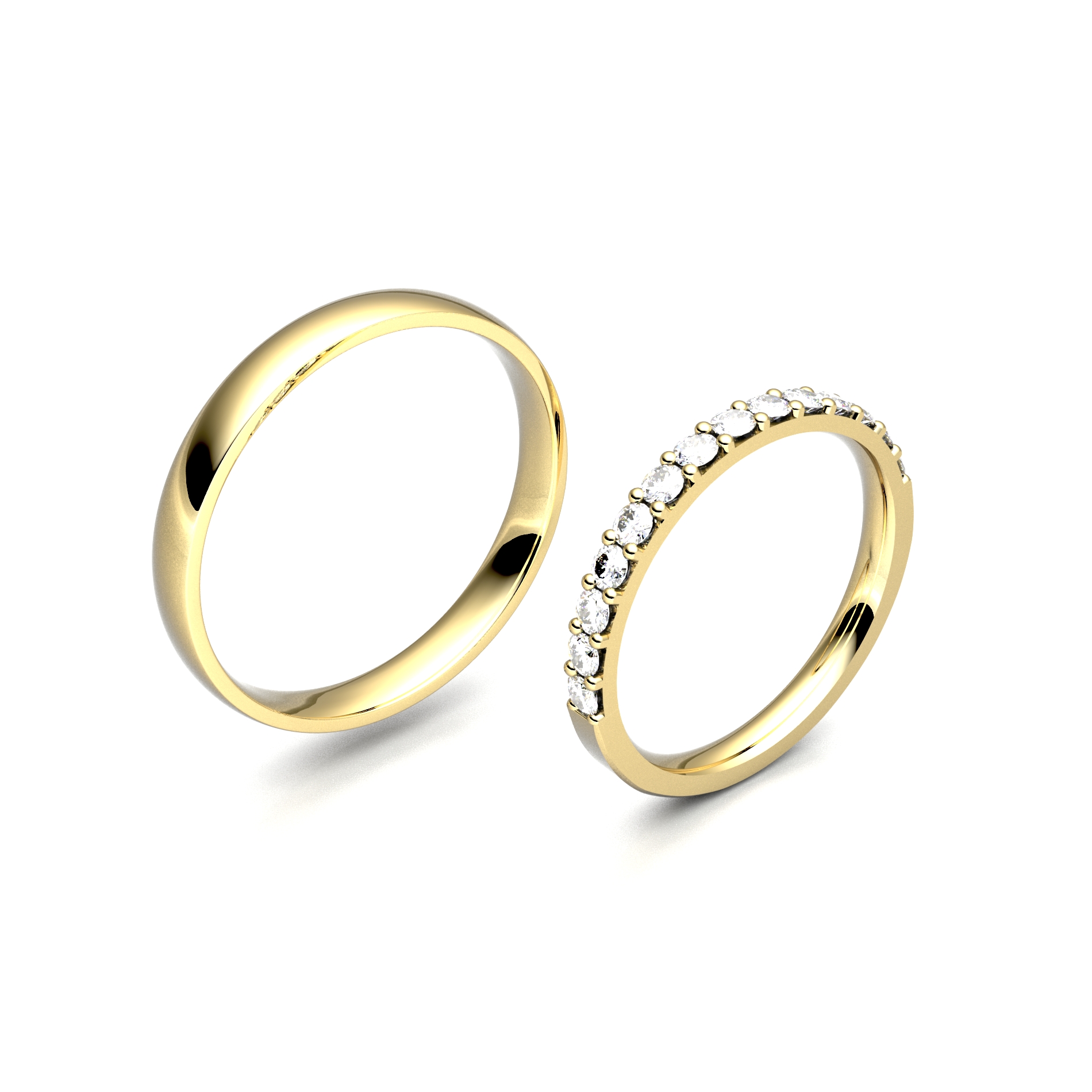 Pánský prsten je pojatý v klasickém hladkém designu s lesklým povrchem, který podtrhuje jeho nadčasovost. Dámský prstýnek je doplněn do půlky kameny o velikosti 2,00 mm, které mu dodávají jemný třpyt a ženskou eleganci. Zákazník si může zvolit typ kamene podle svých preferencí: zirkon, přírodní briliant, laboratorní briliant. Díky decentnímu provedení se krásně doplňuje se zásnubním prstenem a je navržen tak, aby jej nevěsta mohla pohodlně nosit společně s ním. Ideální volba pro páry, které hledají harmonii jednoduchosti a jemného lesku.